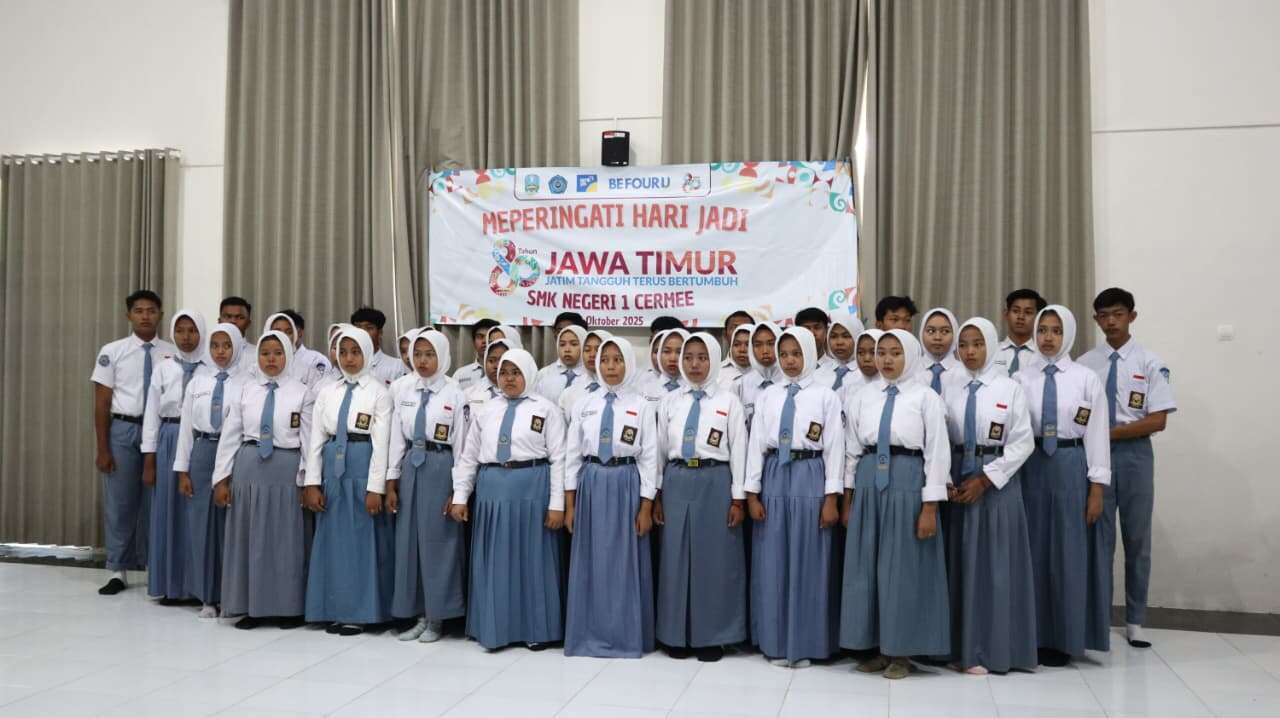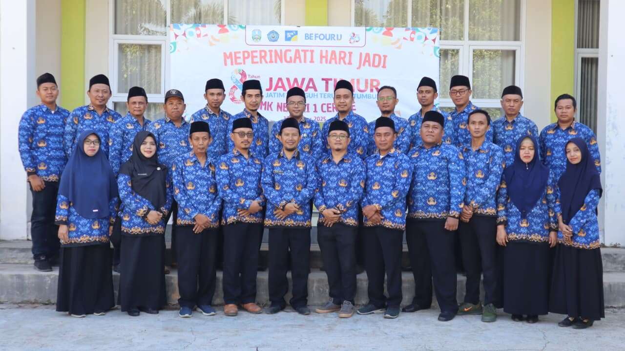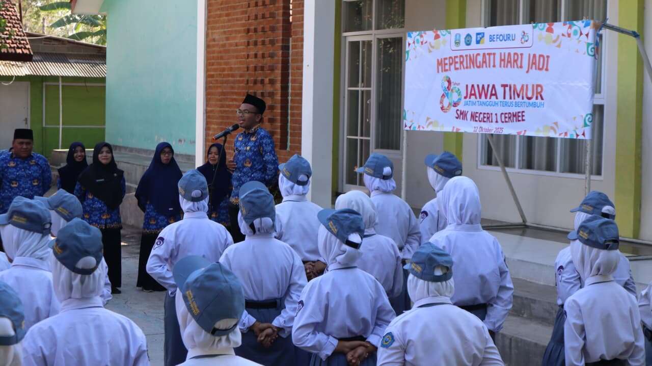 BONDOWOSO - SMK Negeri 1 Cermee menggelar Upacara untuk memperingati Hari Jadi ke-80 Provinsi Jawa Timur pada hari Minggu, 12 Oktober 2025. Seluruh warga sekolah, mulai dari siswa, dewan guru, hingga staf tata usaha, turut serta dalam kegiatan yang dilaksanakan di lapangan sekolah. Upacara yang dimulai tepat pukul 07.00 WIB ini berlangsung dengan penuh khidmat dan disiplin dari seluruh peserta. Kegiatan ini bertujuan untuk menumbuhkan rasa cinta tanah air serta rasa memiliki terhadap Provinsi Jawa Timur di kalangan generasi muda. Bertindak sebagai pembina upacara adalah Sujianto selaku Kepala SMK Negeri 1 Cermee.