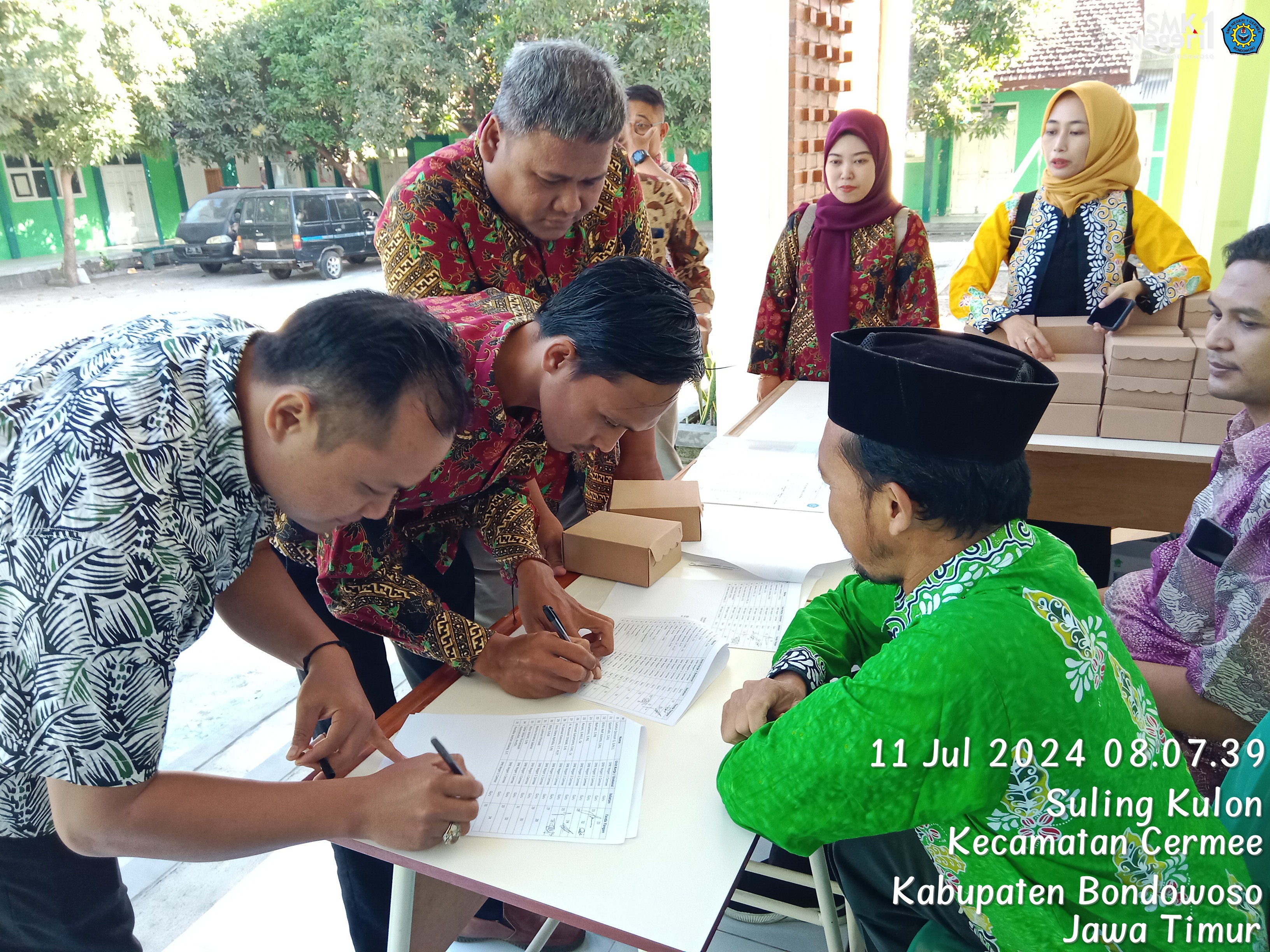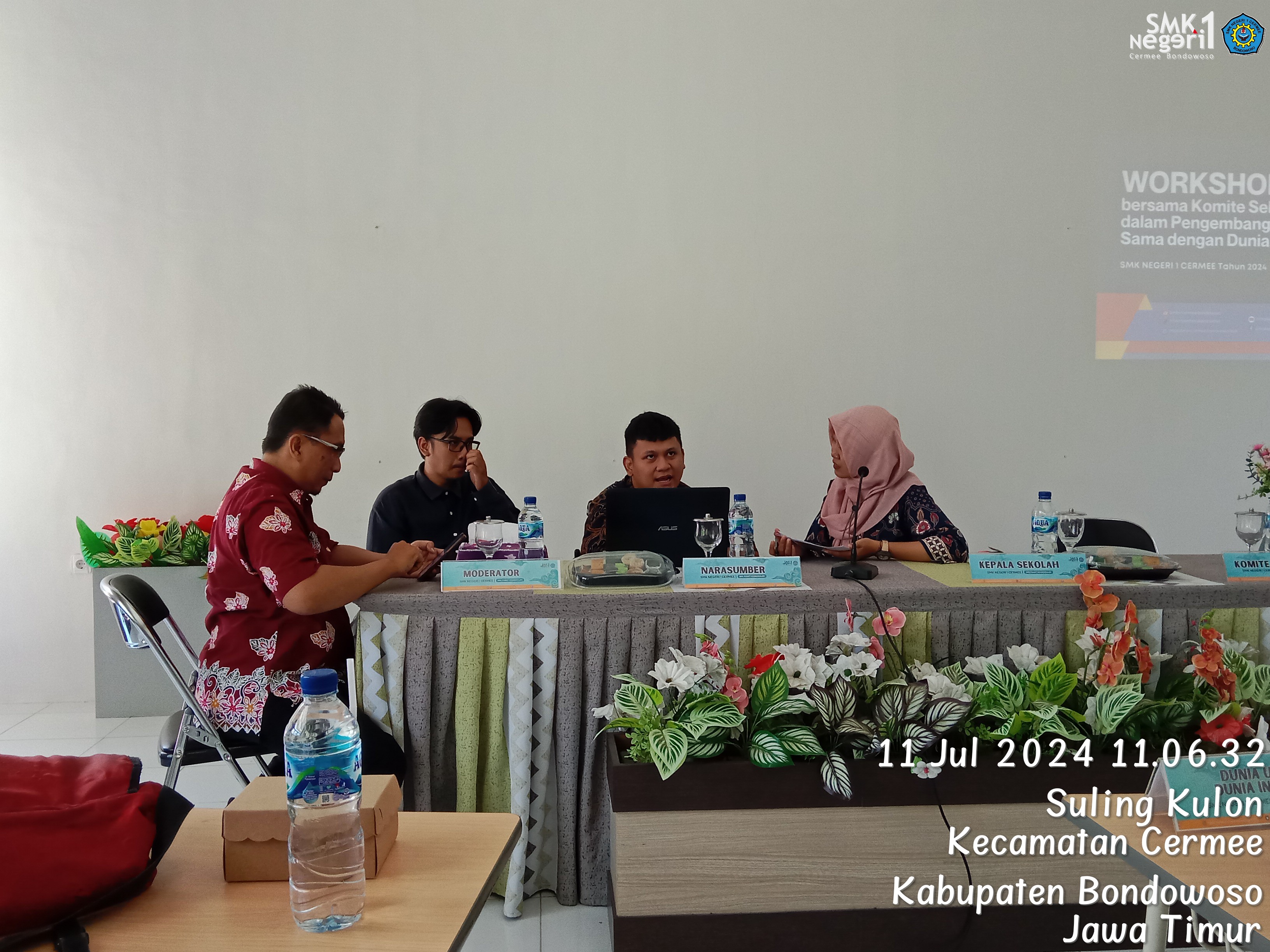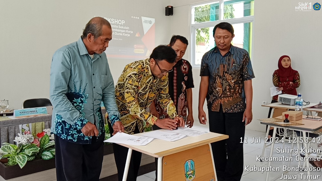 BONDOWOSO - Kamis (11/7) SMK Negeri 1 Cermee mengadakan workshop yang melibatkan komite sekolah dengan tujuan memperkuat kerjasama antara sekolah dan dunia kerja. Acara ini dihadiri oleh Kepala Sekolah, dewan guru, staf tata usaha, komite sekolah, dan perwakilan 4 narasumber DuDi dari berbagai industri yaitu Wiviano Rizky Tantowi (Orens Production Jember), Catur Arya Chandra (Appnovasi Bondowoso), Subari (Car Auto Service Situbondo), dan Abu Haeri (Raja Digiprint Bondowoso). Acara dilaksanakan pukul 07.30 - 13.00 dan bertempat di Lab. Bahasa SMK Negeri 1 Cermee.